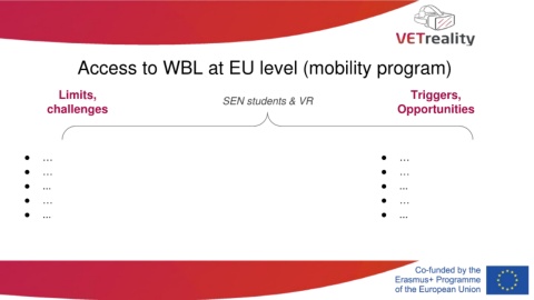 Access to WBL at EU level (mobility program) Limits, SEN students & VR Triggers, challenges Opportunities ● … ● … ● … ● … ● ... ● ... ● … ● … ● ... ● ...
